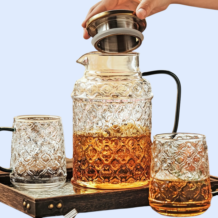 ヴィンテージベゴニアデザインの冷水ケトル。耐熱ガラス製で大容量、食卓を彩るおしゃれな水差し。食洗機対応でお手入れ簡単。